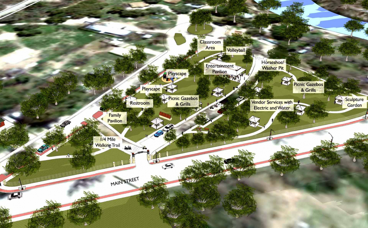 - Permanent features include Legacy Walking Trail, solar lights, and fencing to border the park, restrooms, vendor spaces, and more.